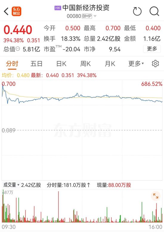 截至收盘,中国新经济投资的股价稍有回落,但涨幅仍接近400%,股价报0.44港元,市值为5.81亿港元。